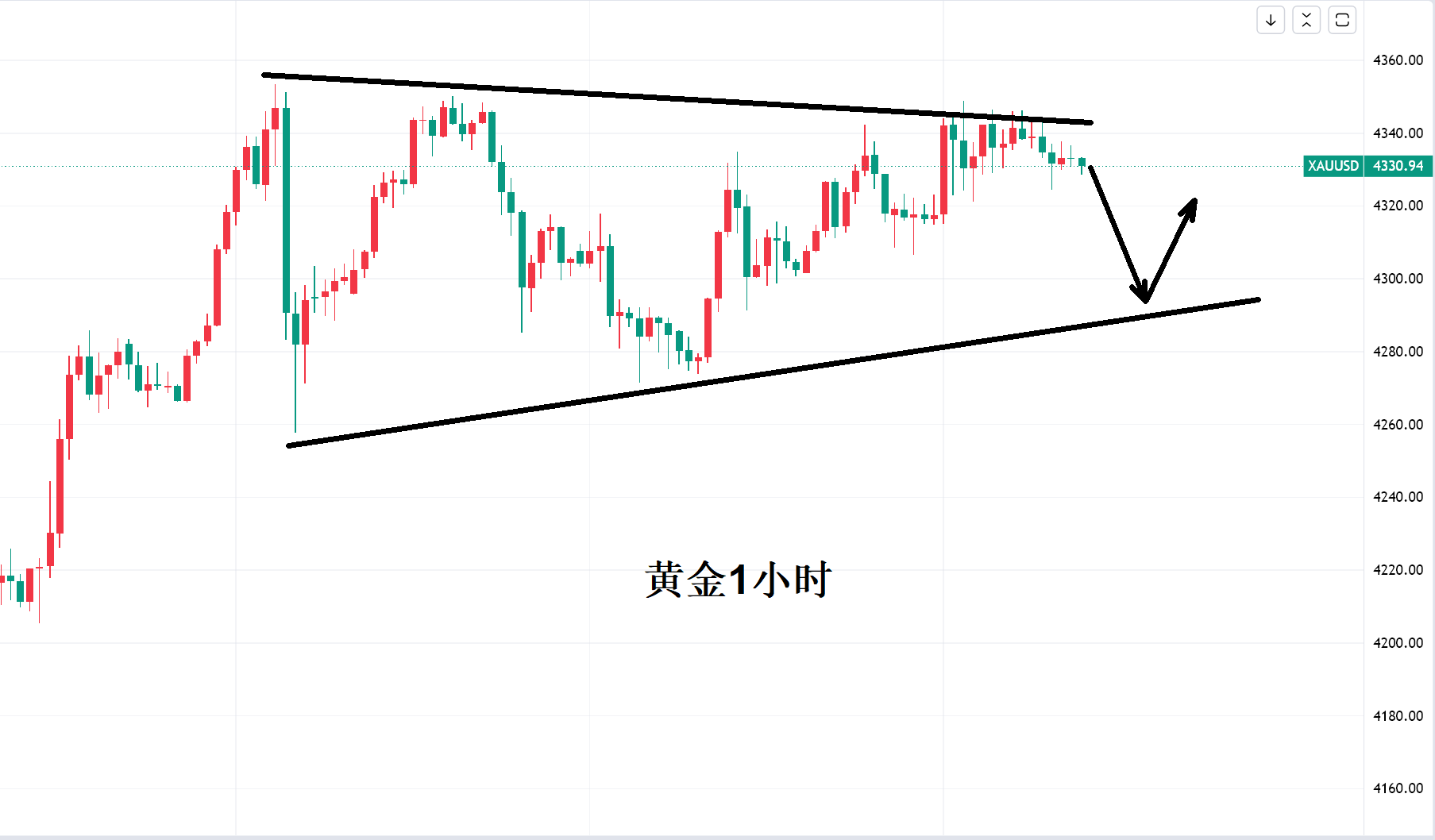 1小时黄金处于高位收敛三角形震荡,主要阻力在4360-4380美元前期高点,而向下空间有机会向4300美元以下进行,白银上涨导致黄金多头高位勇敢上车,主要阻力没有击穿之前过度臆想偏离分析的本质,分析不是猜测,算不是算卦,背靠逻辑和常识规律的推理,比如:突破了怎么走,没有突破如何应用,前提一定是在可预见的事实基础上推理,建立在假设基本上的猜测和抛硬币没区别,时间长了就能感到。