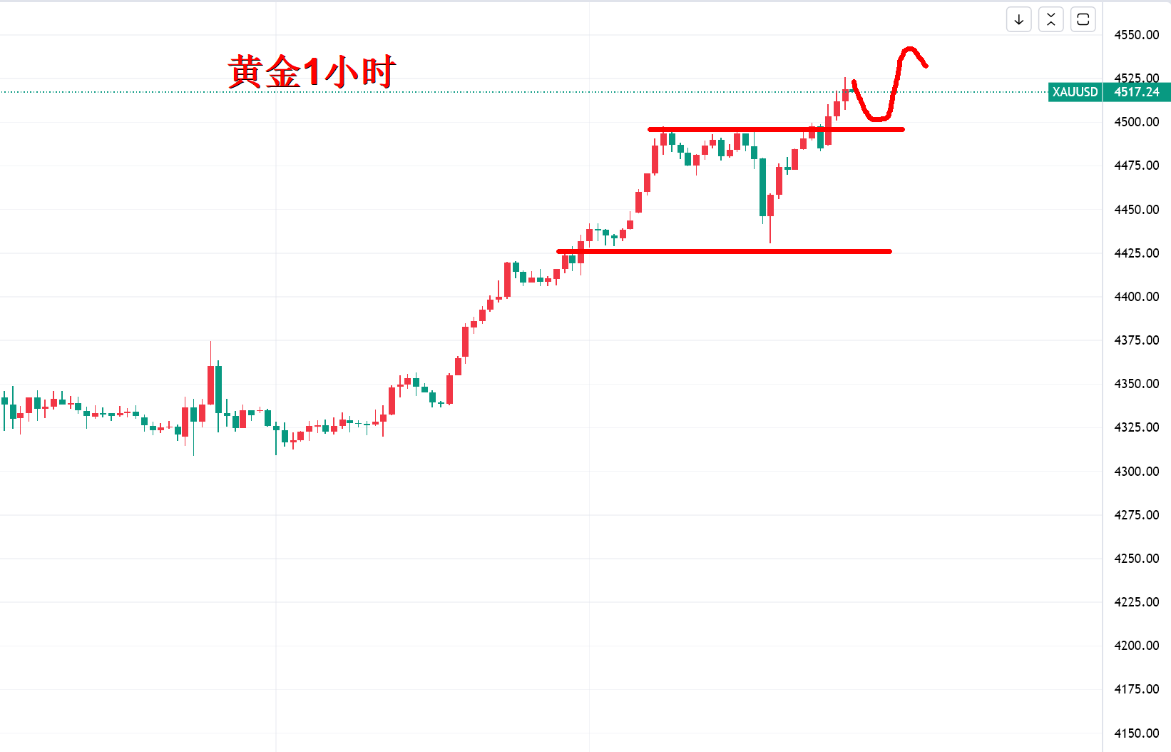 今天黄金压力位置在4520-25美元的位置,而回落后的支撑点4485-4480美元,防守区域重点观察4450美元。欧盘过了前高点美盘前回踩做多,以及欧盘