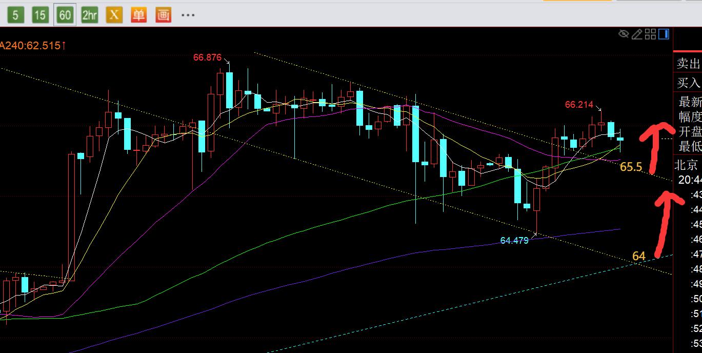 白银方面:日线级别强势逼空格局不变,日内继续回踩看涨;从上图看,黄色下行通道日内有所上破,也提出一旦突破站上65.5,回踩确认可延续拉升,最高66.2,力度暂时不大;今晚继续关注65.5,能稳住则继续拉升,也就是要守住小时线中轨,不能收盘失守;若失守,则等待64大通道下轨支撑的上方找位置企稳继续看涨;日线级别可能大阳之后,再高位横盘几日后再强拉;