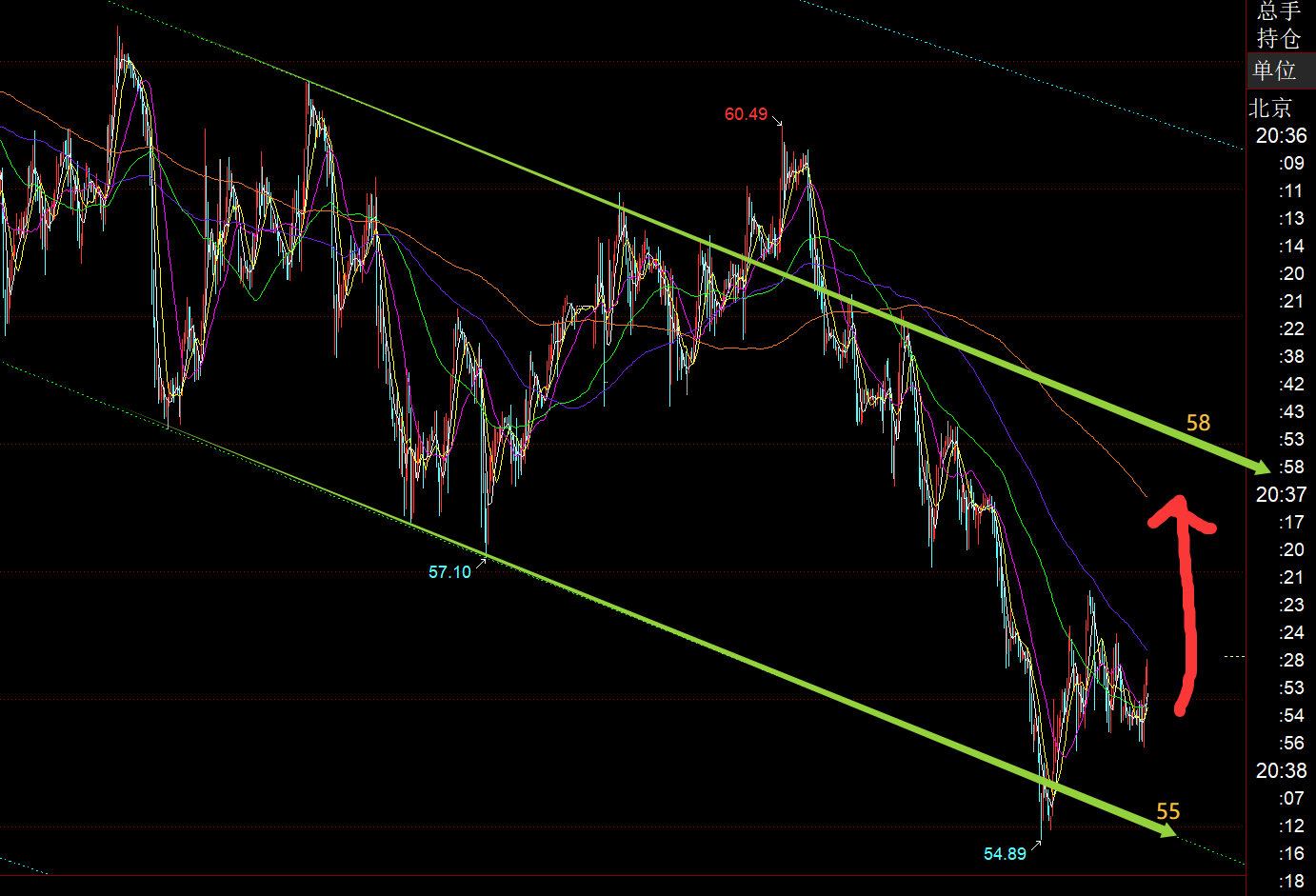 原油方面:前天通道下轨稳住后,迎来一波探底拉升,之后陷入了区间性整理,虽波动缓慢,但近期一直围绕下行通道上下轨运行的规律依旧有效;因此,只要下轨稳住,迟早会去试探上轨; 今日亚欧盘压制55.9之下窄幅横盘,欧盘探底拉升连阳破高,那么美盘存在延续反弹动能,上方短线阻力目标57、57.5、58关注;