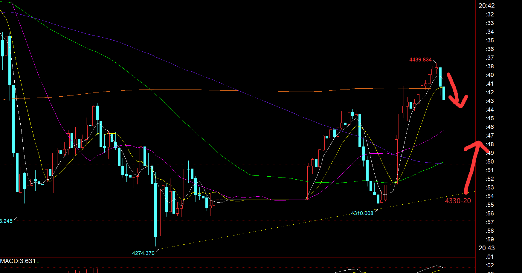 第二,黄金4小时级别:上周五夜间支撑4310后,一路连阳发展,今日高位出阴也暂时只是单阴,形态上走的是一轮逼空,10均线目前上移4443,也是欧盘回踩打出的低点;今晚若失守它,则逼空结束,会有一波回踩动作,下方留意4420及下方的企稳;