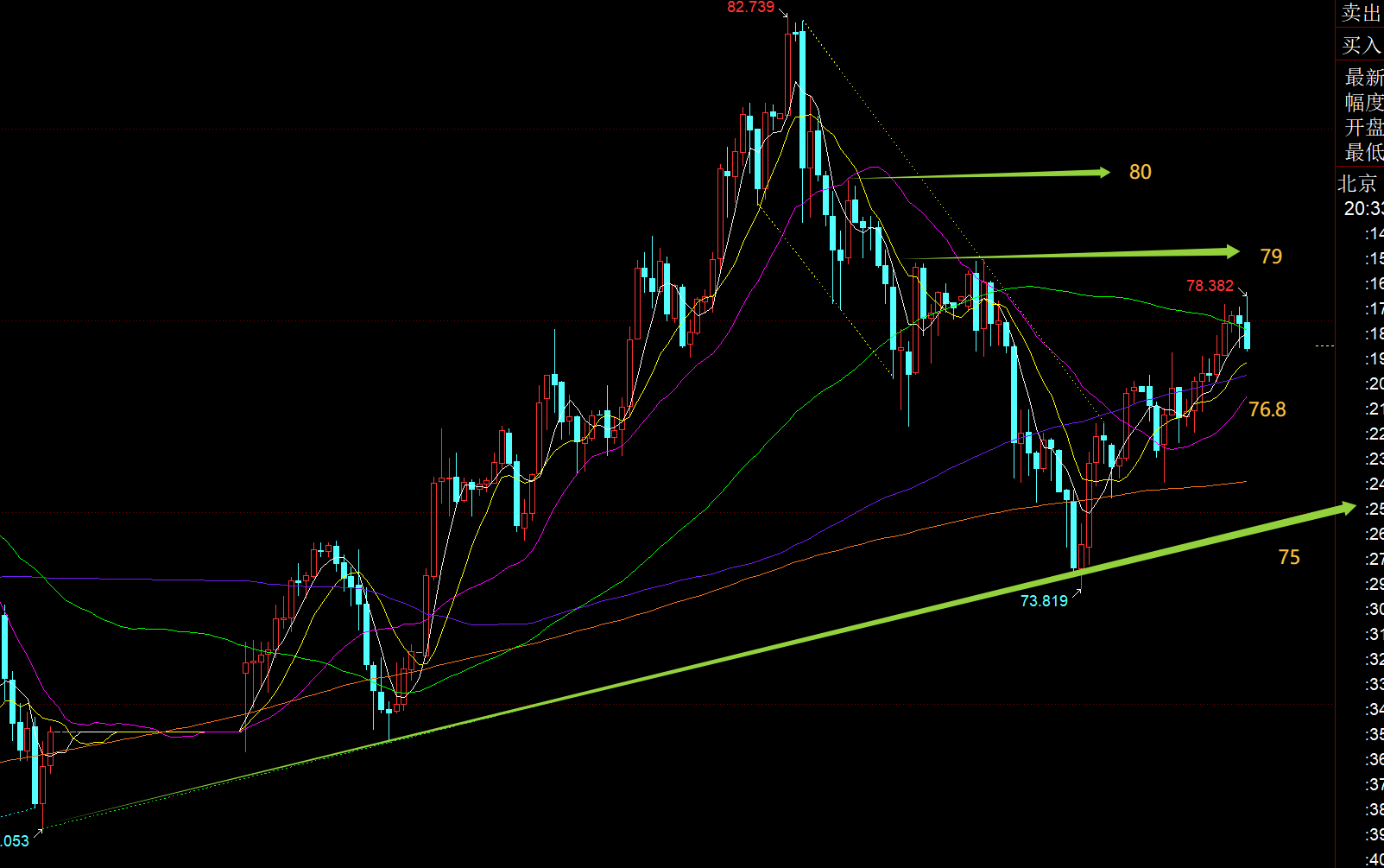 第二,白银方面:昨日明确指出74-75上继续看北,最低点刚好企稳74,今日拉升至78的上方;