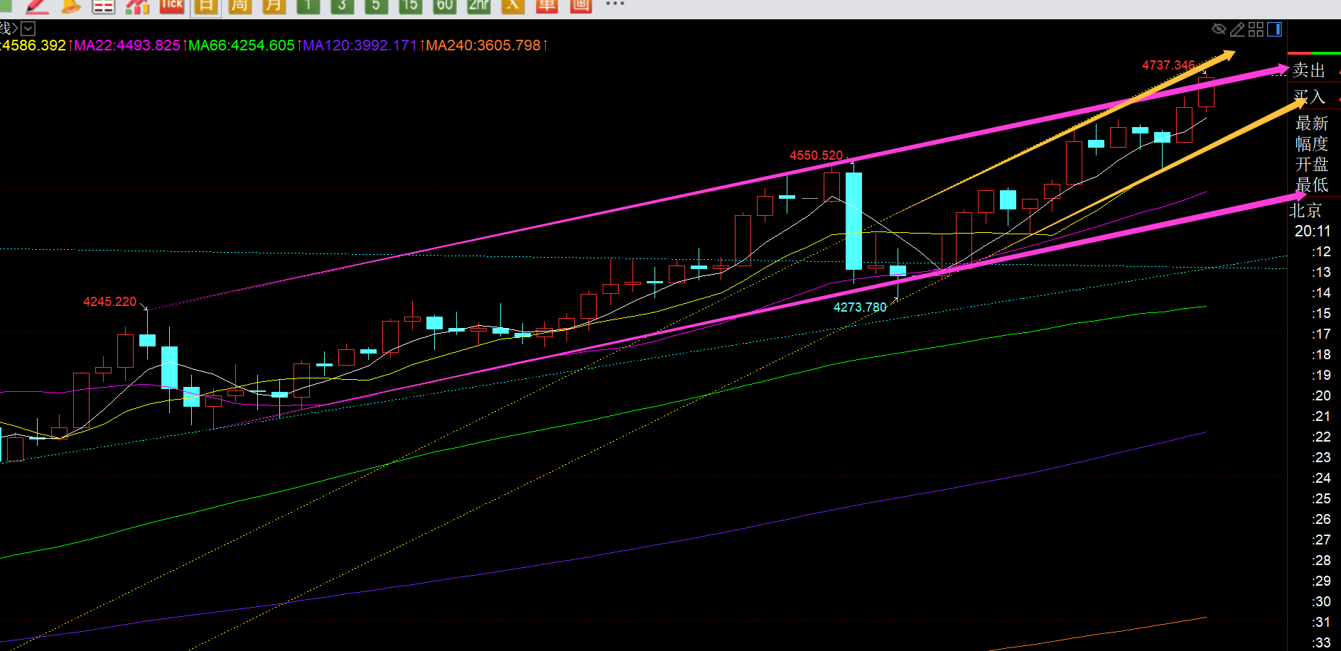 第一,黄金日线级别:从上图通道分布来看,紫色通道上轨阻力4718一线今日有所刺穿突破,比预期的力度有所强,那么黄色通道上轨阻力今日对应是4765一线,同时也要最终K线收线来确认,是否有效站上紫色通道上轨;按照近期黄金的走势规律,一根大阳突破前面箱体整理区间之后,很快又容易陷入另一个高位的区间,所以直接连阳强势单边一路上攻的可能性暂时不大;稳扎稳打,一个台阶一个台阶的拉高,大阳+横盘+大阳+横盘这种模式运行下去,其实是相对稳的,可以延续相对久些;所以,接下来本周几日就观察高位是否再出现新的箱体区间;