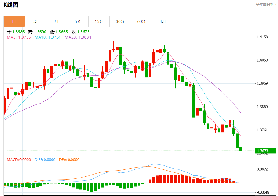 从日线结构来看,美元兑加元(USD/CAD)已进入明显的下行通道。汇价连续多日收阴,并有效跌破前期重要支撑位1.3750,下探至1.3675一线,刷新阶段新低,显示空头力量占据主导。