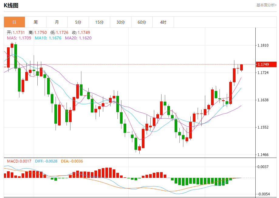 欧元/美元在过去两天几乎上涨1.2%后正在回调,推动技术指标进入超买水平。 4小时相对强弱指数(RSI)为63,此前曾突破70,移动平均趋同/背离(MACD)指标已转为平坦,表明看涨动能减弱。