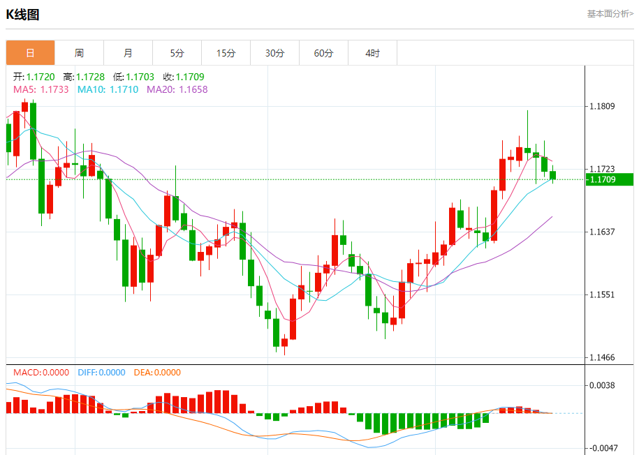 今日周五,截止目前欧元兑美元报1.1711,下跌0.09%。