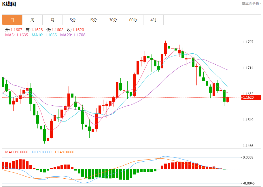 欧元兑美元报1.1610,徘徊在12月底高点下降通道底部附近。移动平均收敛背离(MACD)滑落至4小时图的零线以下,动能减弱,相对强弱指数(RSI)同期在36,凸显了看跌趋势。