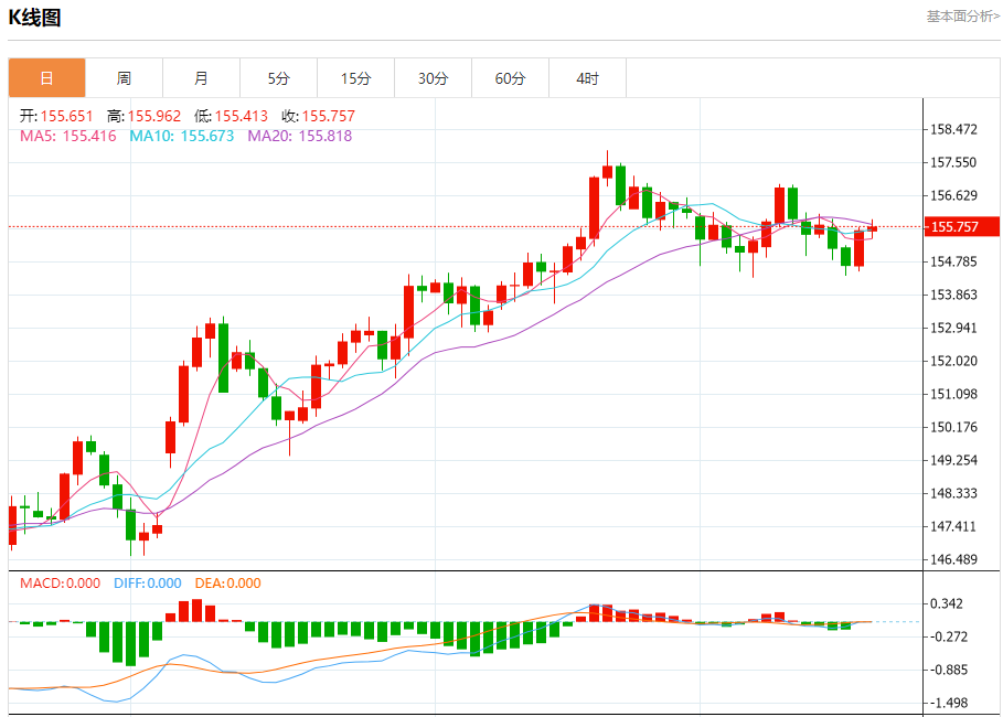 今日周四,截止目前美元兑日元报155.761,上涨0.07%。