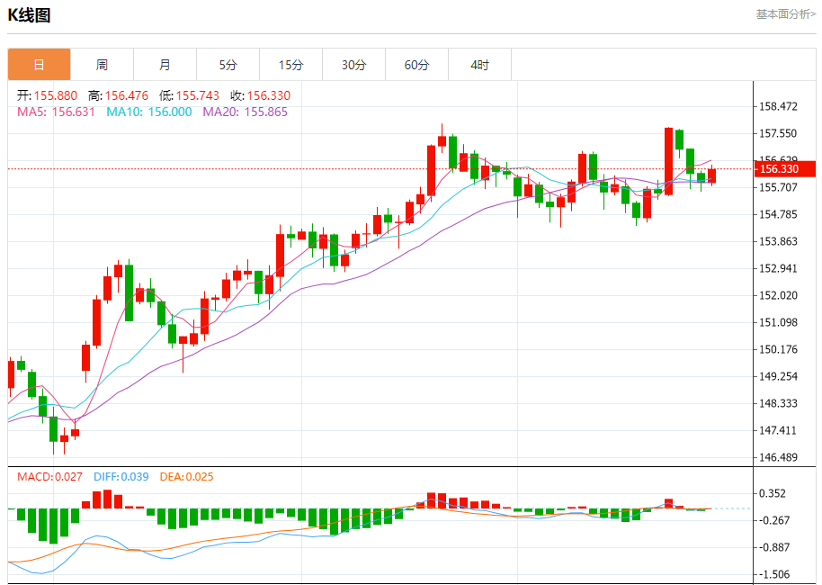 日线级别:自158回落形成双顶雏形,5日、10日均线走平,155.7—156.8为短期震荡区间;跌破155.7则下探155.0—155.2,突破156.8则向157.0—157.2发起冲击。