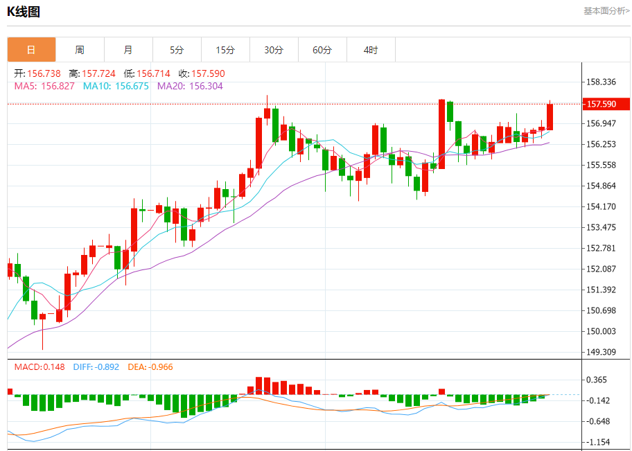 在撰写时,美元/日元在156.76附近平稳交易。 该货币对在154.40和157.90之间交易已超过六周。 价格保持在上升的20日指数移动均线(EMA)156.35之上,保持短期上升趋势完好。 20日EMA的正斜率支持在回调时的需求。