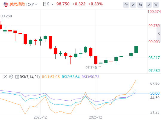 美元指数上周突破了11月21日低点的下跌通道,目前走高。4小时图表显示美元指数交易于98.72,移动平均收敛背离线(MACD)线位于信号线之上,两条线均处于正区间。相对强弱指数(RSI)为66,凸显了多头势头