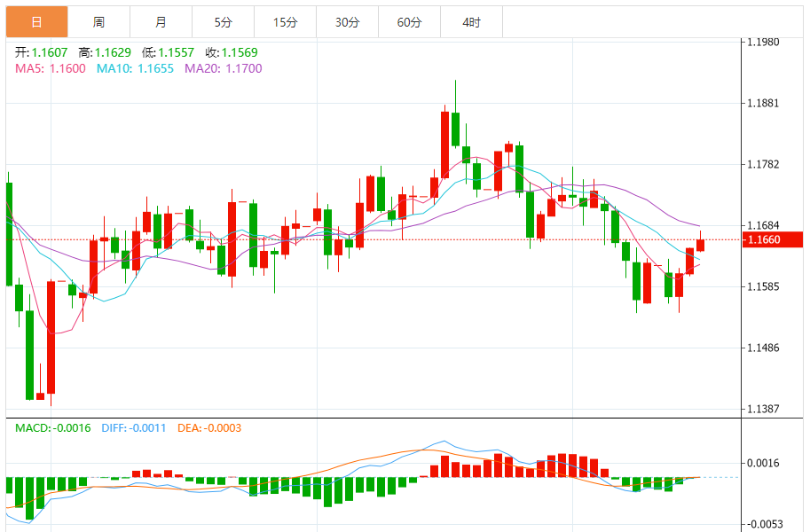 周四,欧元/美元徘徊于1.1662下方,现交投于1.1661附近,涨幅0.11%。