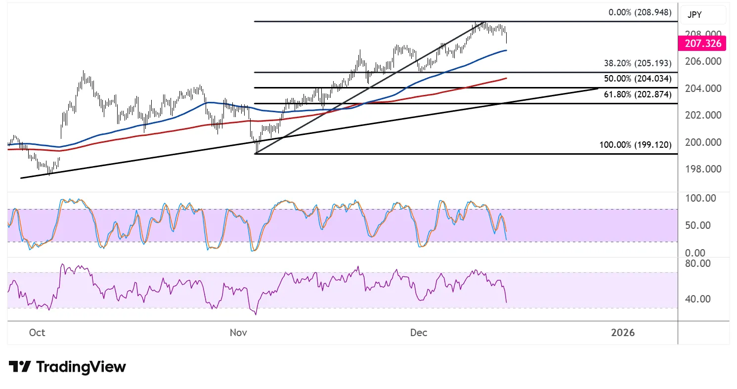 应用于199.12波幅低点起反弹的斐波那契回撤工具显示,价格目前正测试205.19的38.2%斐波那契水平与204.03的50%回撤区间。这些区块与一条上升趋势线相吻合,该趋势在整个上涨趋势中提供动态支撑,形成技术支撑的汇聚,可能对买家具有吸引力。