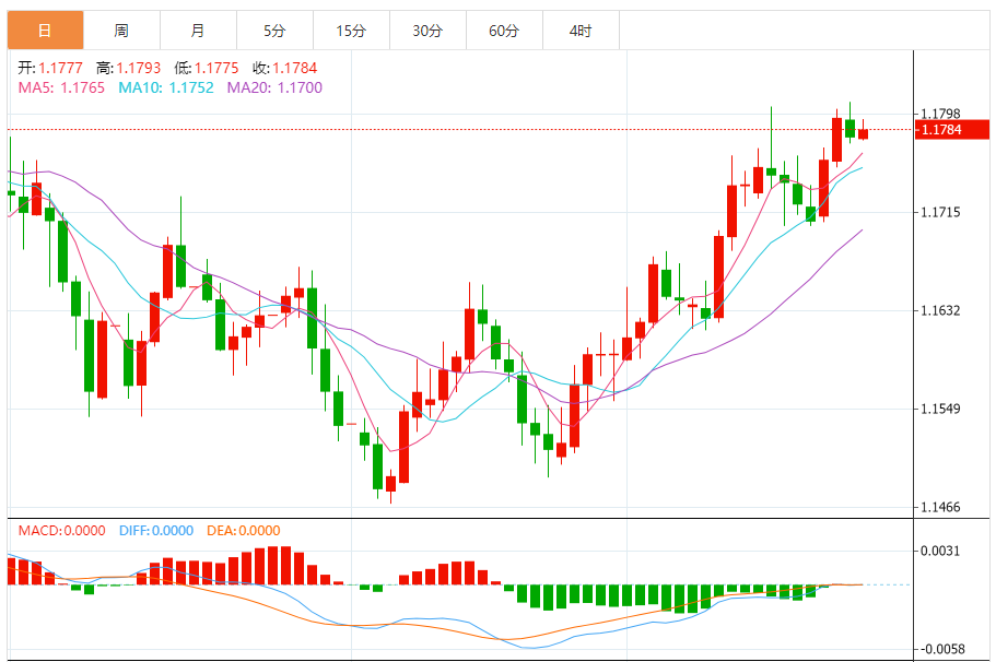 周五,欧元/美元徘徊于1.1785下方,现交投于1.1784附近,涨幅0.06%。
