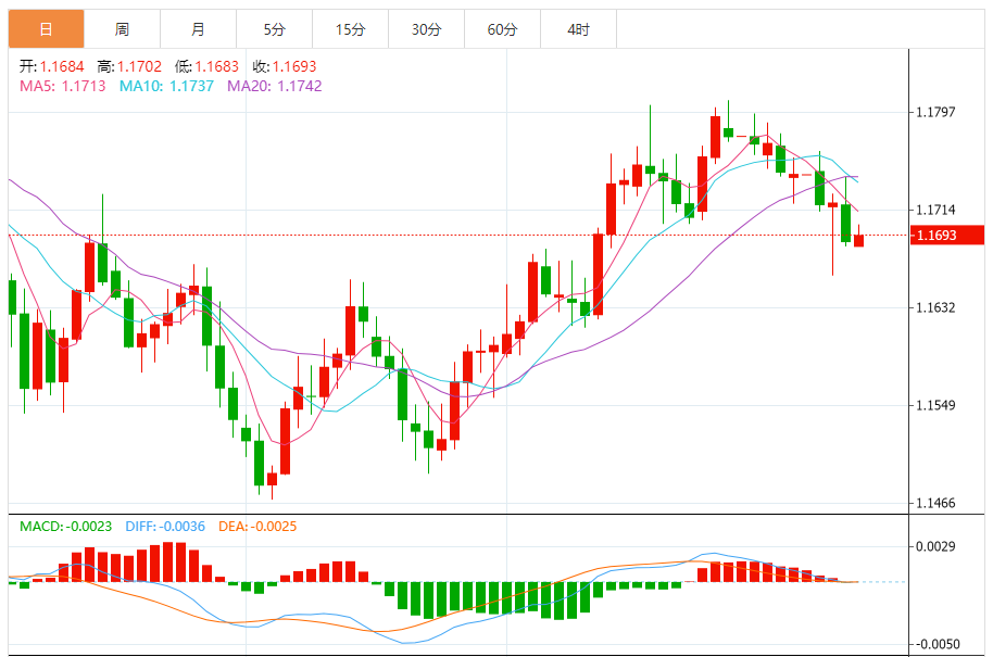 周三,欧元/美元徘徊于1.1694下方,现交投于1.1692附近,涨幅0.04%。