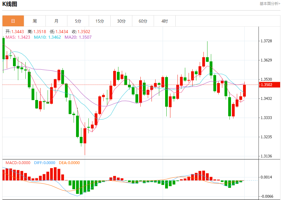 英镑/美元:截止北京时间20:23,英镑/美元上涨,现报1.3504,涨幅0.44%。纽市盘前,(GBPUSD) 价格在日内交易的最后阶段略有下跌,受到 EMA50 阻力位的影响,迫使其下探,尤其是相对强弱指标出现负面信号,提示形成负向背离,如果负面信号持续,将加剧下行压力,同时在短期内看空波动占主导地位。
