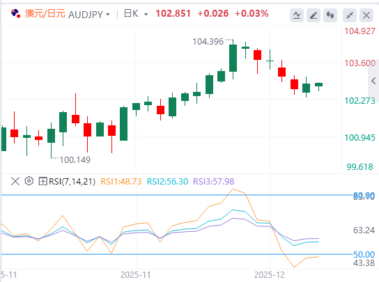 日线图中,澳元兑日元报102.70。该货币对稳守100日均线99.44以上,保持整体上涨趋势。平均值上升,强化了买入跌点的倾向。RSI在54.91为中性至轻度正值,反映出温和但稳定的动能。价格位于布林带中段102.61稍上,包线上方倾斜,显示趋势持续。