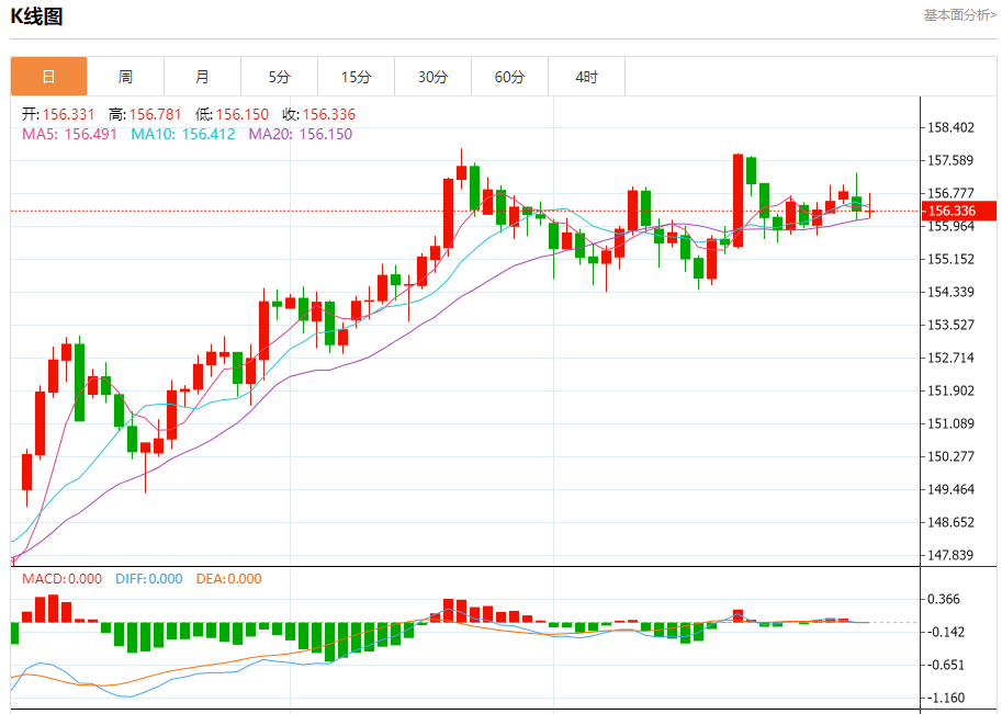 200期简单移动平均线(SMA)持续上涨,美元兑日元保持上方,强化了看涨倾向。移动平均线收敛背离线(MACD)位于信号线之上,略微处于正区间,直方图略微上升,暗示动能增强。200期均线156.04为直接动态支撑。