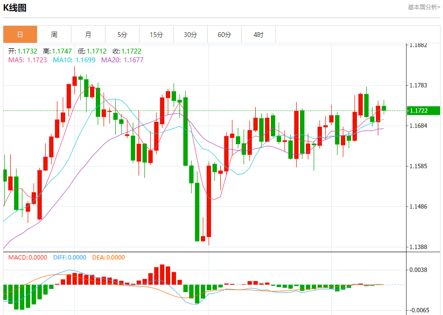 汇价高见1.1763,低见1.1716。上一交易日,汇价收于1.1730。