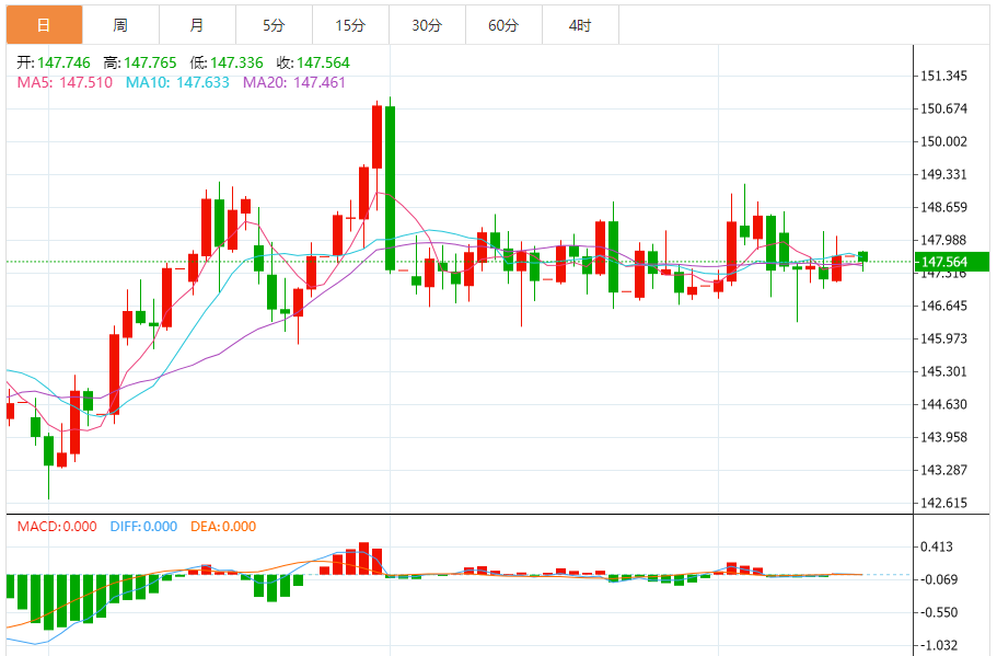汇价高见147.765,低见147.247。上一交易日,汇价收于147.663。