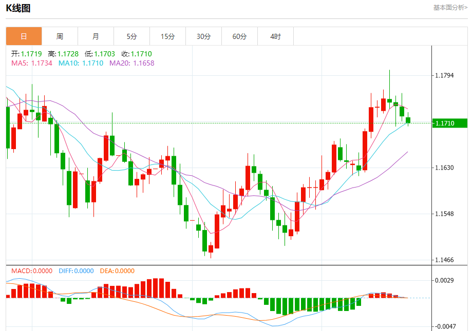 汇价高见1.1728,低见1.1703。上一交易日,汇价收于1.1722。