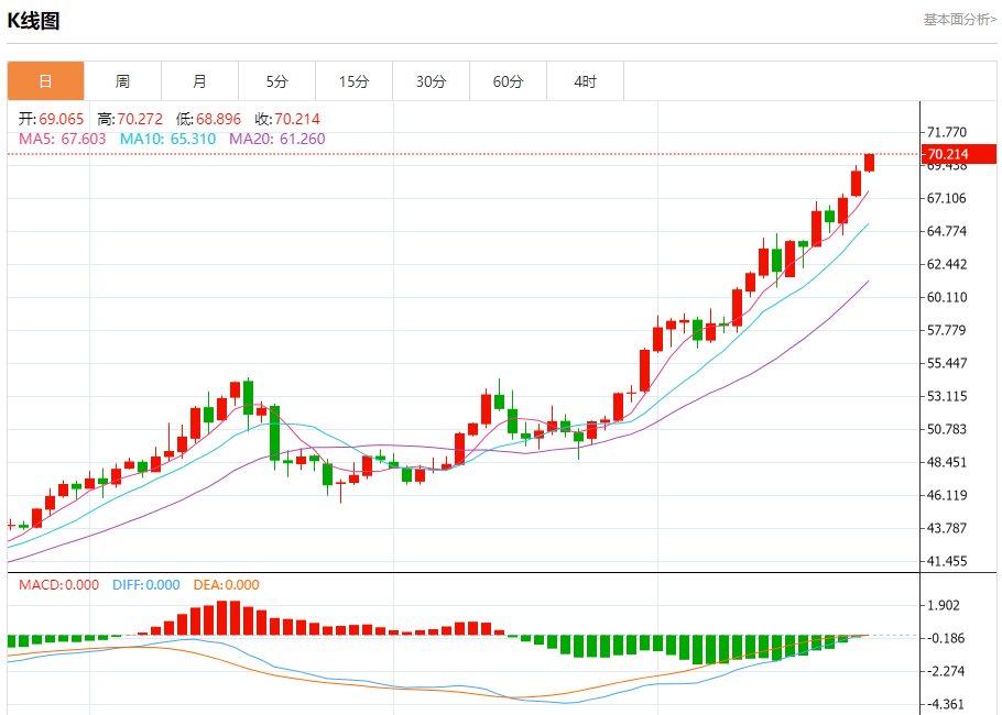 现货白银:截止北京时间21:20,现货白银上涨,现报70.218,涨幅1.73%。纽市盘前,(白银)价格试图在最后一个盘中交易中喘口气,准备在其历史上首次达到70.00美元的主要阻力,利用其在趋势线上方交易所代表的动态支撑,以及相对强度指标的积极信号的出现,在卸载其超买条件后,为在即将到来的时期创下新的历史新高铺平了道路。