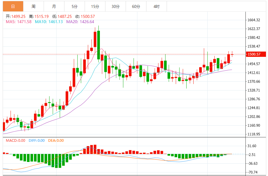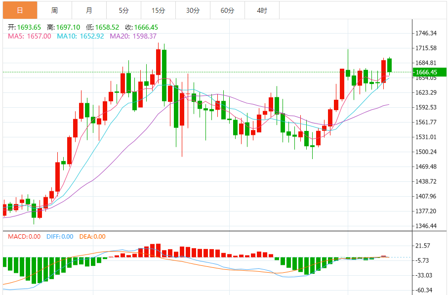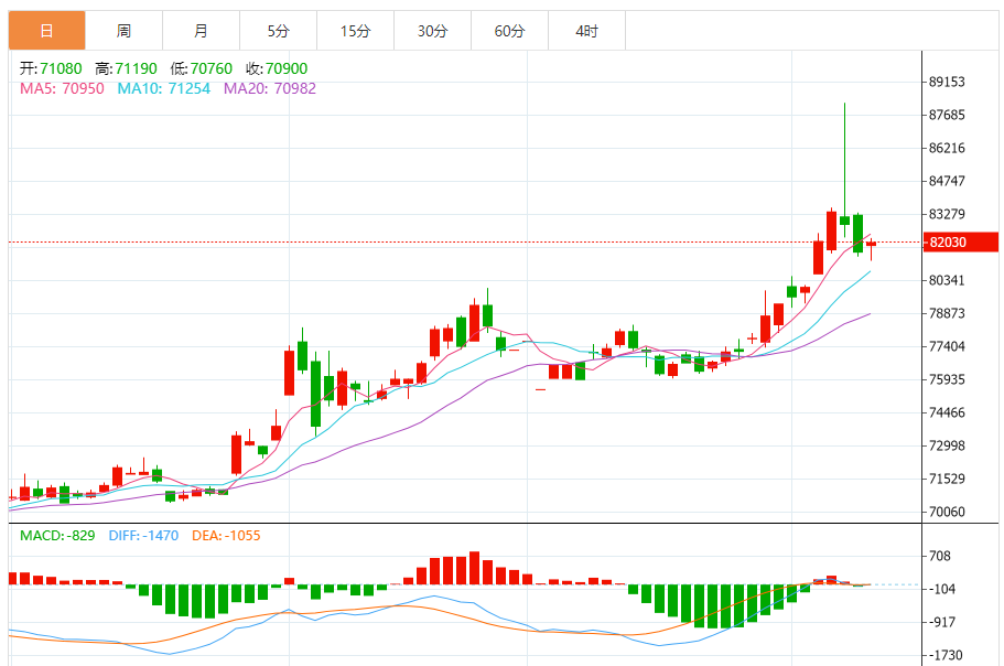 日线级别:白银形成典型的“牛旗形态”,突破60美元关键关口后持续走高,均线呈多头排列,多头趋势强劲。MACD指标在零轴上方运行,动能柱持续放大,显示多头力量充足。