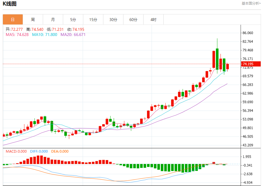 阻力位:第一阻力72.80美元/盎司(38.2%回撤位);第二阻力74.83美元/盎司(日线枢轴点第一阻力);强阻力79.06美元/盎司(日线枢轴点第二阻力)。