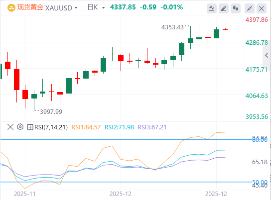 然而,相比之下,我们对国际现货白银和铂金等其他贵金属变得更为谨慎,这些金属近几周已显示出超买迹象。在市场供应短缺时,这些金属会与国际现货黄金同步上涨(甚至在价格上涨期间能展现出更强的上涨动能,正如我们今年所见);国际现货黄金仍受到宏观经济因素的有力支撑,明年利率下降将拖累美元走低,而不断上升的债务水平使美元在全球货币贬值交易中依然脆弱。