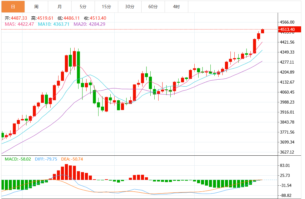 金价隔夜突破持续近两个月的上升趋势通道阻力位,并随后强势突破4500美元/盎司心理关口,这可能被视为黄金多头的新一轮上涨动力。此外,移动平均收敛/发散指标(MACD)线位于信号线上方且高于零轴,同时不断扩大的正柱状图也表明多头动能正在增强。