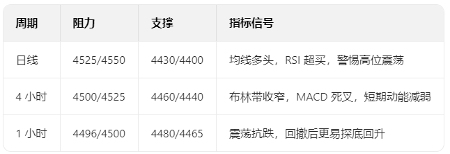 日内即时阻力:4500美元(整数关口+短期筹码密集区)。亚盘多次上攻未有效站稳,为日内多空分水岭;站稳则打开上探4525—4530空间,承压则回落测试4480—4490支撑。