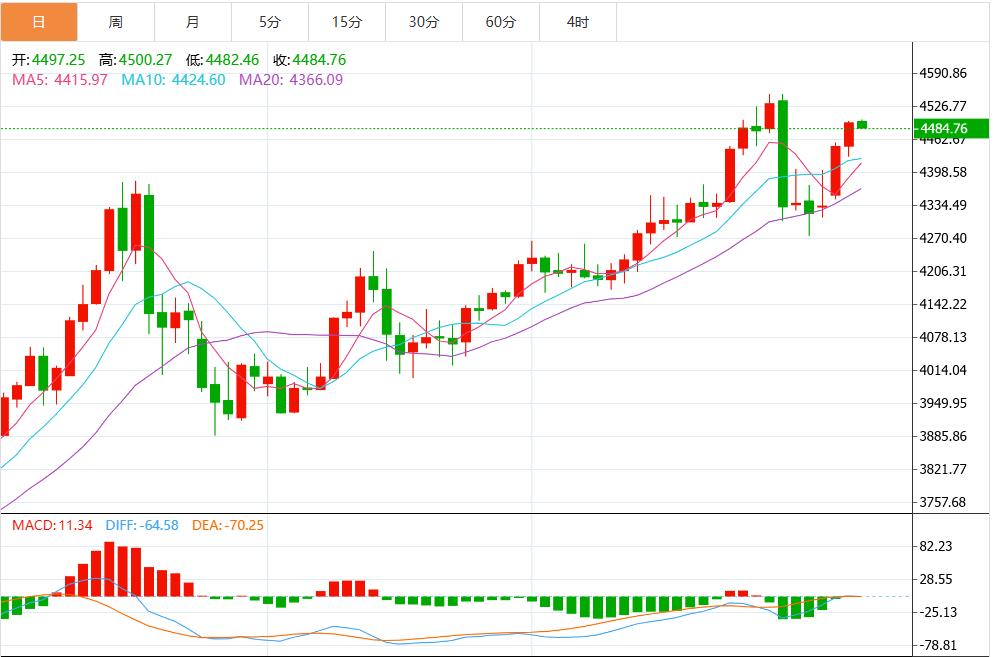 技术分析:4500美元限制上行,多头捍卫4450美元支撑位