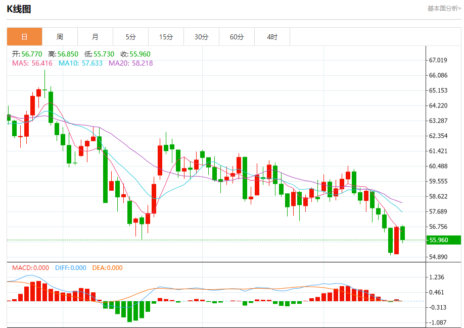 周四盘中,WTI原油报55.960,涨幅0.27%。